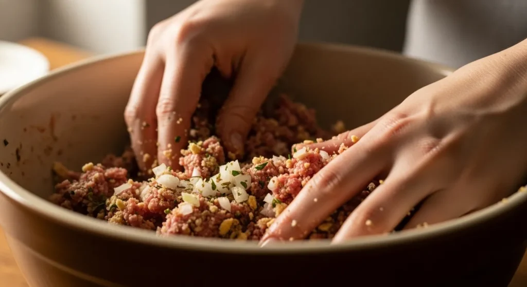 Combine milk, eggs, salt, and pepper first. Then add crackers, onion, and pepper. Fold in beef last. Overmixing ruins texture.