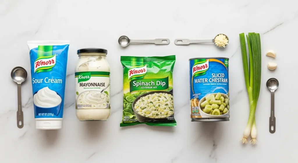 The knorr recipe for spinach dip is a no-bake dip designed for convenience and balance. The vegetable soup mix brings onion, garlic, and dried vegetables. Sour cream adds tang. Mayo adds richness. Spinach adds freshness. Water chestnuts add crunch.